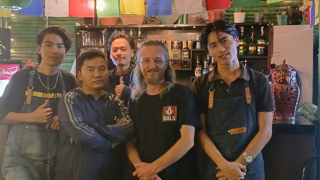 Your author with the owner and staff of Sekuwa Bank, a restaurant on the northern end of Kathmandu. (Photo by author, ca. 2023).